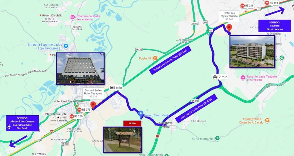 Para quem vem do Rio de Janeiro, a viagem é um pouco mais longa: cerca de 319 km, com tempo estimado de 4 h 00 min de carro até Caçapava.